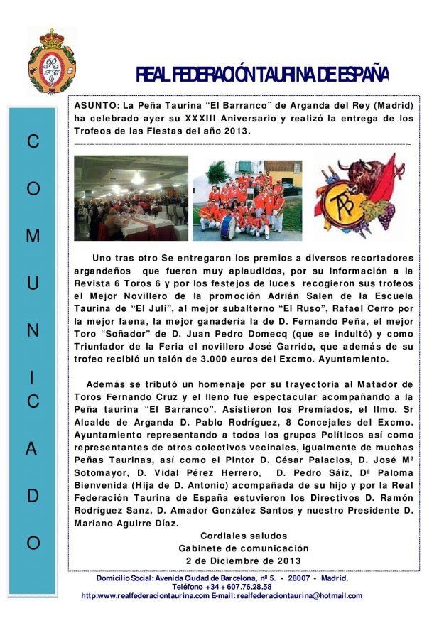 La Peña Taurina El Barranco ha celebrado su XXXIII Aniversario entregando los Trofeos de las Fiestas del año 2013 2013, HemerotecaPor Claudia Starchevich4 diciembre, 2013 Informa Real Federación Taurina de España