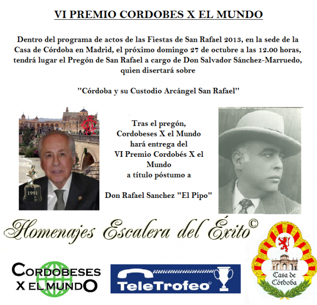 Asociación Cordobeses X el Mundo rendirá homenaje In Memoriam a Don Rafael Sánchez Pipo. Escalera del Éxito 7 2013, HemerotecaPor Claudia Starchevich25 octubre, 2013 Informa Redacción Sabios del Toreo