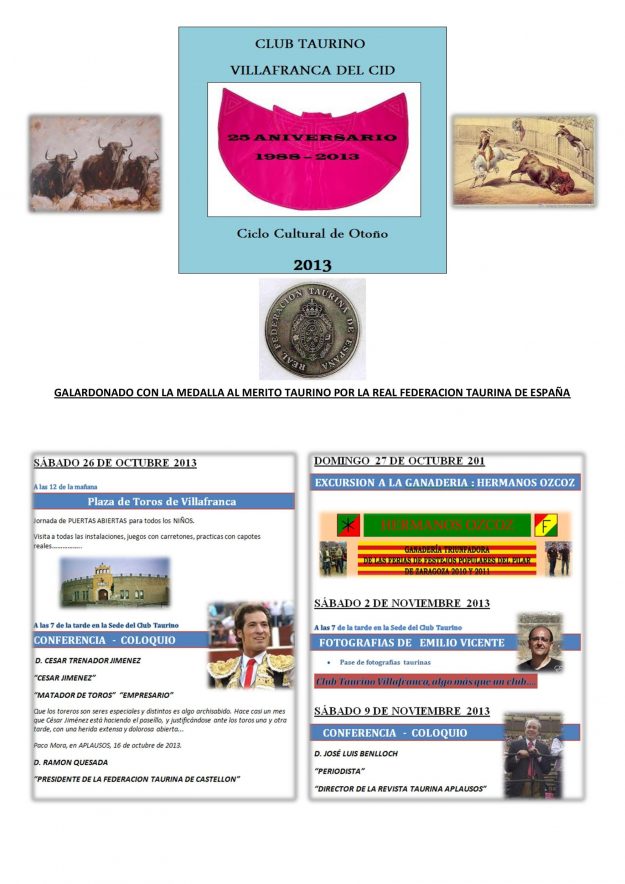 Ciclo Cultural de Otoño. Club Taurino Villafranca del Cid 2013, HemerotecaPor Claudia Starchevich23 octubre, 2013 Informa Real Federación Taurina de España