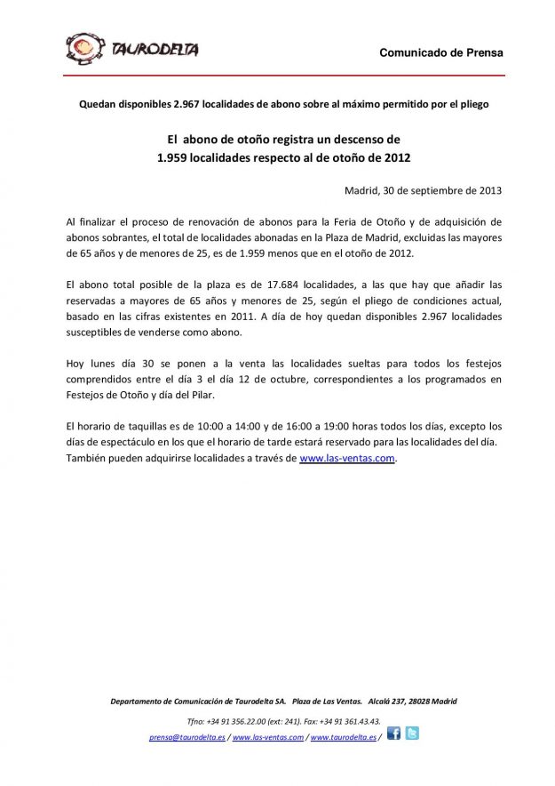 El abono de otoño registra un descenso de 1.959 localidades respecto al de otoño de 2012 2013, HemerotecaPor Claudia Starchevich1 octubre, 2013 Informa Taurodelta