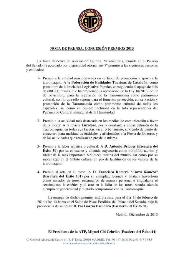 Premios ATP 2013, HemerotecaPor Claudia Starchevich20 diciembre, 2013 Informa Federación Taurina Comunidad de Madrid