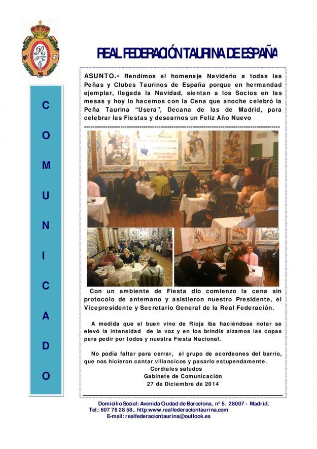 Cena celebrada en la Peña Taurina `Usera´ , Decana de las de Madrid 2014, HemerotecaPor Claudia Starchevich30 diciembre, 2014 Informa Real Federación Taurina de España