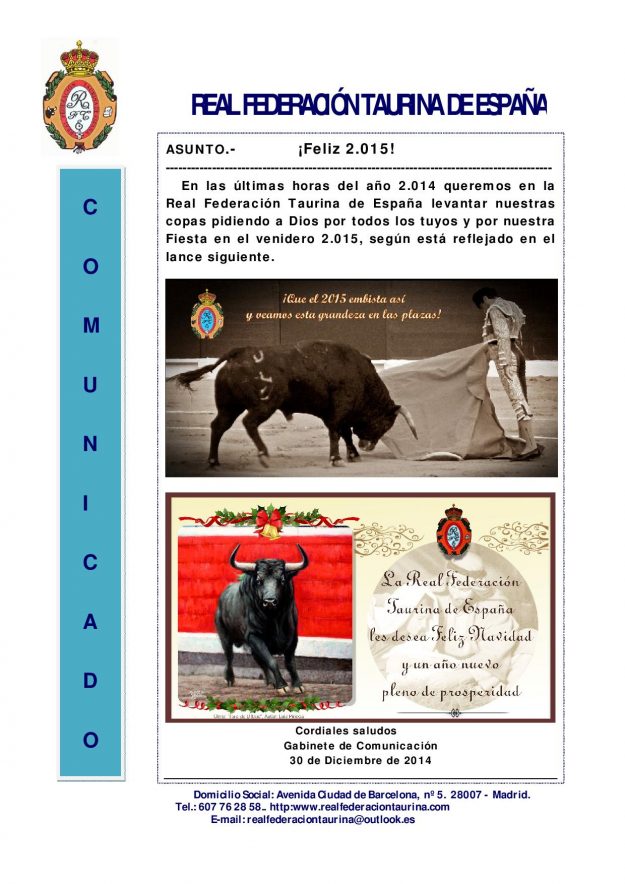 ¡Feliz 2.015! 2014, HemerotecaPor Claudia Starchevich31 diciembre, 2014 Informa Real Federación Taurina de España