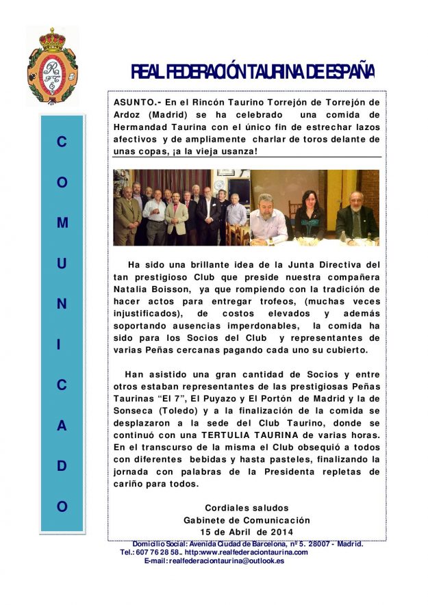 Celebrada comida de Hermandad Taurina en el Rincón Taurino Torrejón en Torrejón de Ardoz (Madrid) 2014, HemerotecaPor Claudia Starchevich23 abril, 2014 Informa Real Federación Taurina de España