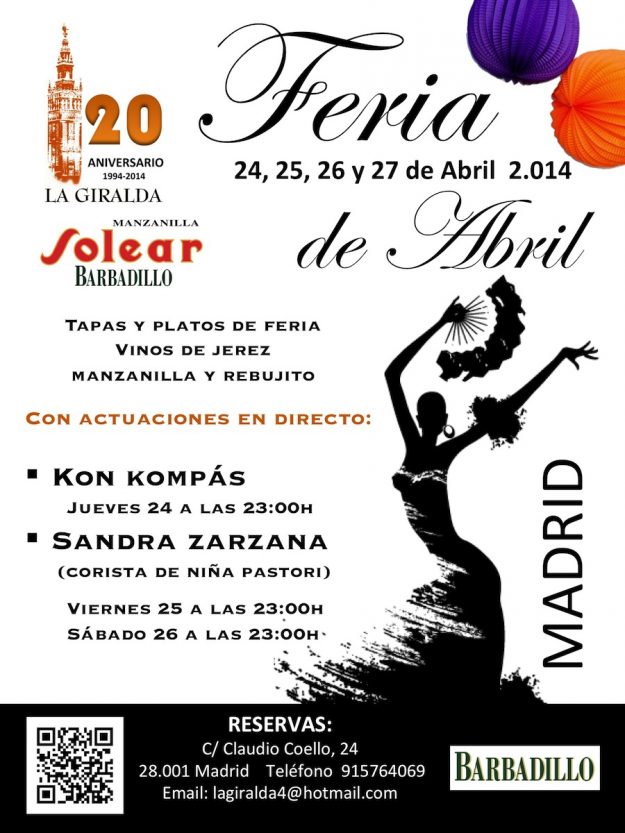 Gran Feria de Abril este fin de semana en Madrid, con motivo del 20 Aniversario del Restaurante La Giralda IV 2014, HemerotecaPor Claudia Starchevich24 abril, 2014 Informa VR Comunicaciones