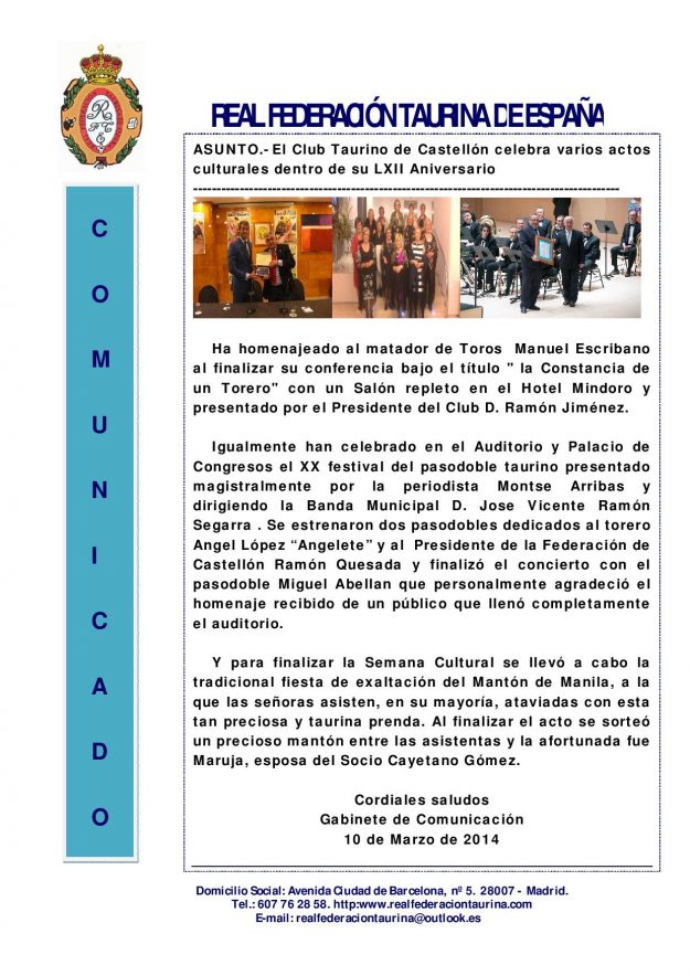 Club Taurino de Castellón celebra varios actos culturales dentro de su LXII Aniversario 2014, HemerotecaPor Claudia Starchevich13 marzo, 2014 Informa Real Federación Taurina de España