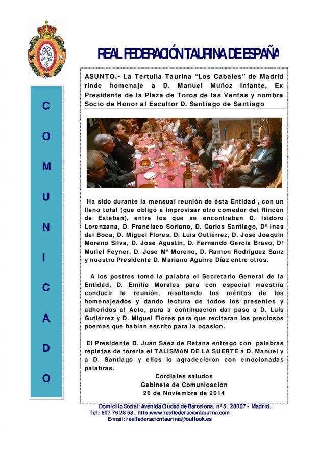 Tertulia Taurina `Los Cabales´rinde homenaje a D. Manuel Muñoz Infante y nombra Socio de Honor a D. Santiago de Santiago (Escalera del Éxito 92) 2014, HemerotecaPor Claudia Starchevich28 noviembre, 2014 Informa Real Federación Taurina de España
