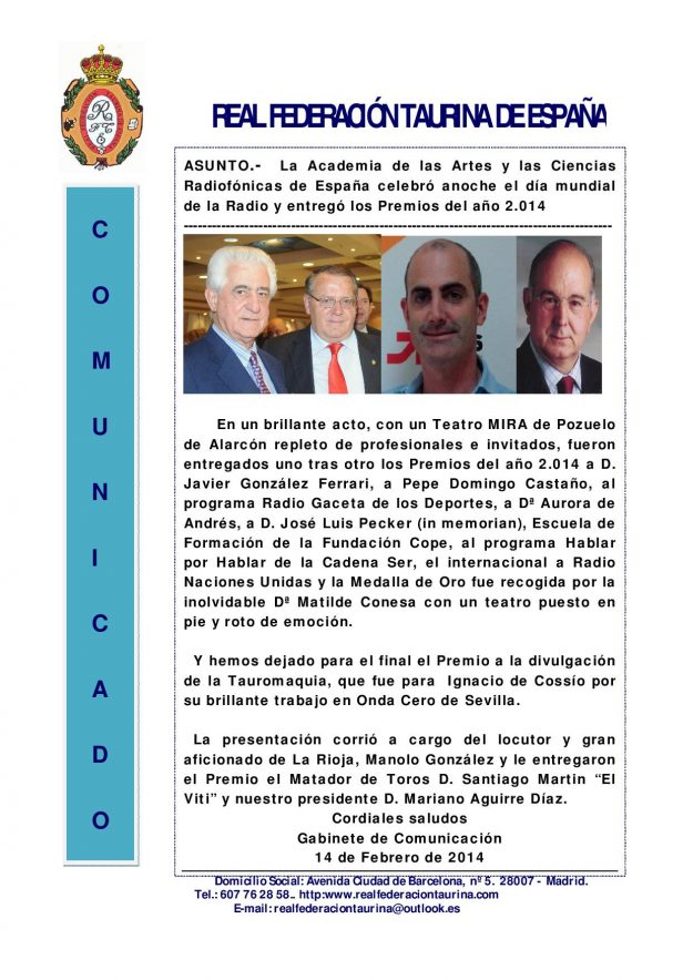 Academia de Artes y Ciencias Radiofónicas de España celebró el día mundial de la Radio y entregó Premios 2.014 2014, HemerotecaPor Claudia Starchevich17 febrero, 2014 Informa Real Federación Taurina de España