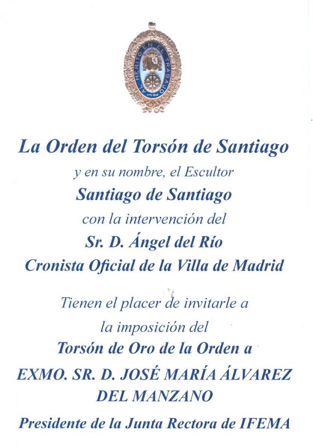 Excmo. Sr. Don José Mª Álvarez del Manzano (Escalera del Éxito 54) recibirá la Orden del Torsón de Santiago 2014, HemerotecaPor Claudia Starchevich21 octubre, 2014 Informa Redacción Sabios del Toreo