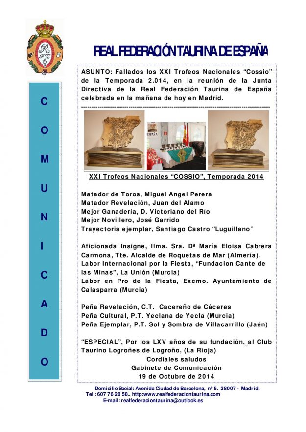 Fallo de los XXI Trofeos Nacionales COSSIO. Temporada 2014 2014, HemerotecaPor Claudia Starchevich21 octubre, 2014 Informa Real Federación Taurina de España
