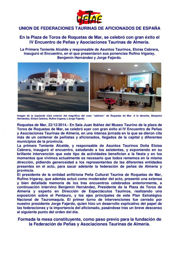 IV Encuentro de Peñas y Asociaciones Taurinas de Almería 2014, HemerotecaPor Claudia Starchevich26 diciembre, 2014 Informa UFTAE