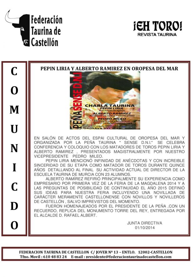 Pepin Liria y Alberto Ramirez en Oropesa del Mar 2014, HemerotecaPor Claudia Starchevich7 octubre, 2014 Informa Federación Taurina de Castellón