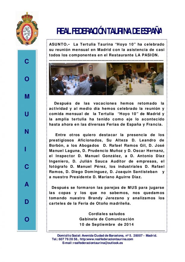 Tertulia Taurina Hoyo 10 celebraó su reunión mensual en Madrid 2014, HemerotecaPor Claudia Starchevich12 septiembre, 2014 Informa Real Federación Taurina de España