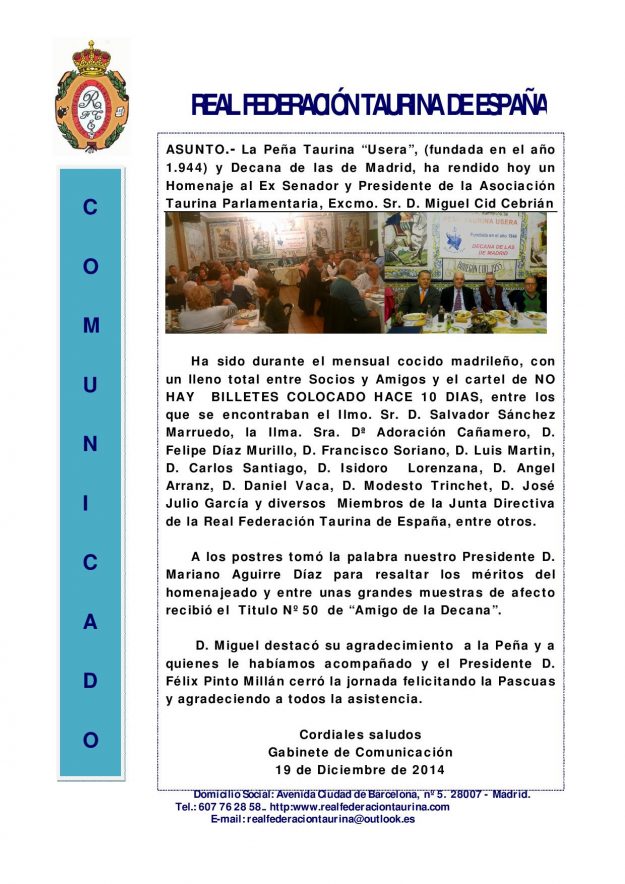La Peña Taurina `Usera´ ha rendido un homenaje al Excmo. Sr. D. Miguel Cid Cebrián (Escalera del Éxito 44) 2014, HemerotecaPor Claudia Starchevich22 diciembre, 2014 Informa Real Federación Taurina de España