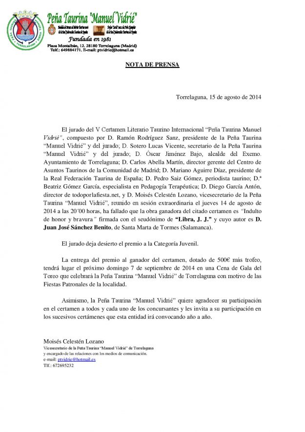 Certamen Literario P.T. Manuel Vidrie 2014, HemerotecaPor Claudia Starchevich4 septiembre, 2014 Informa Real Federación Taurina de España