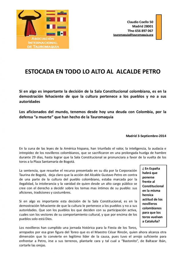 Estocada en todo lo alto al Alcalde Petro 2014, HemerotecaPor Claudia Starchevich4 septiembre, 2014 Informa Asociación Internacional de Tauromaquia
