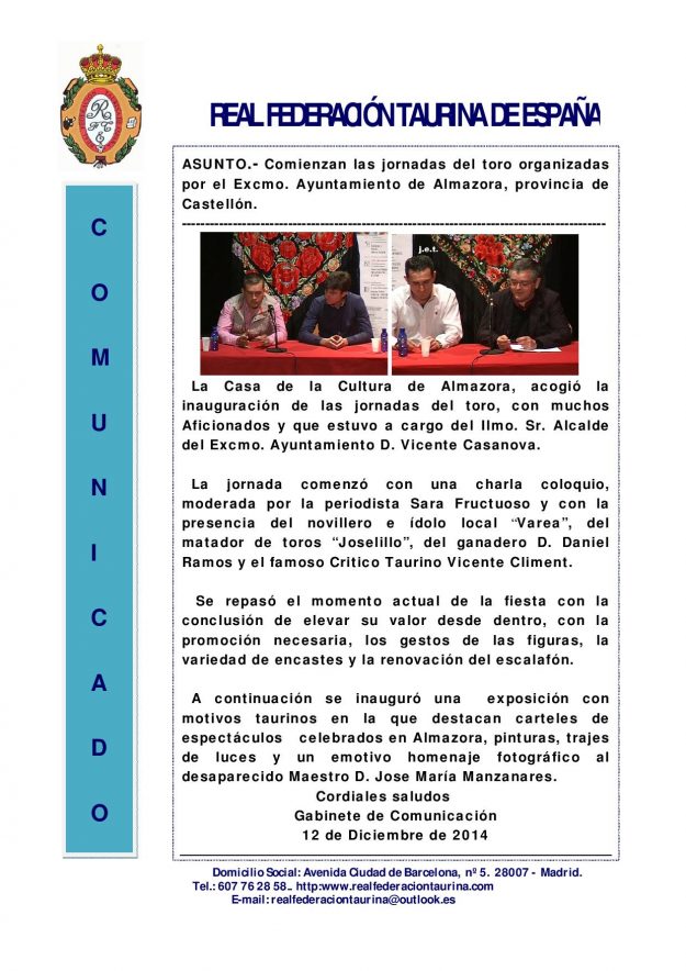 Jornadas del toro organizadas por el Excmo. Ayuntamiento de Almazora, provincia de Castellón 2014, HemerotecaPor Claudia Starchevich18 diciembre, 2014 Informa Real Federación Taurina de España