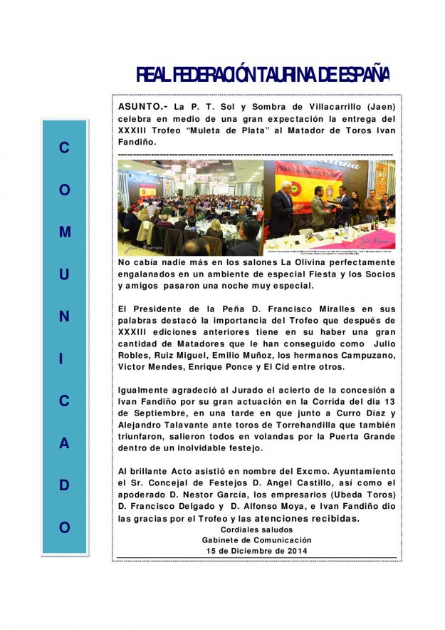 Entrega el XXXIII Trofeo `Muleta de Plata´ al Matador de Toros Ivan Fandiño 2014, HemerotecaPor Claudia Starchevich19 diciembre, 2014 Informa Real Federación Taurina de España