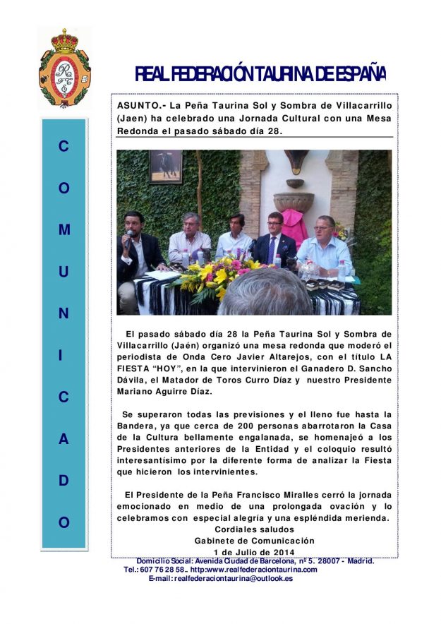 Peña Taurina Sol y Sombra de Villacarrillo (Jaen) ha celebrado su Jornada Cultural con una Mesa Redonda 2014, HemerotecaPor Claudia Starchevich3 julio, 2014 Informa Real Federación Taurina de España
