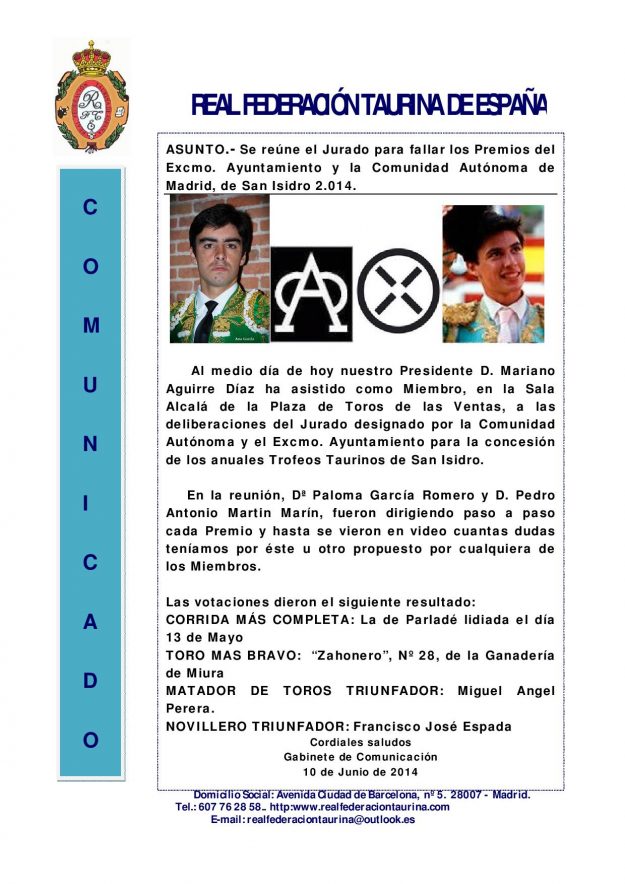 Fallados los Premios del Excmo. Ayuntamiento y la Comunidad Autónoma de Madrid de San Isidro 2.014 2014, HemerotecaPor Claudia Starchevich12 junio, 2014 Informa Real Federación Taurina de España