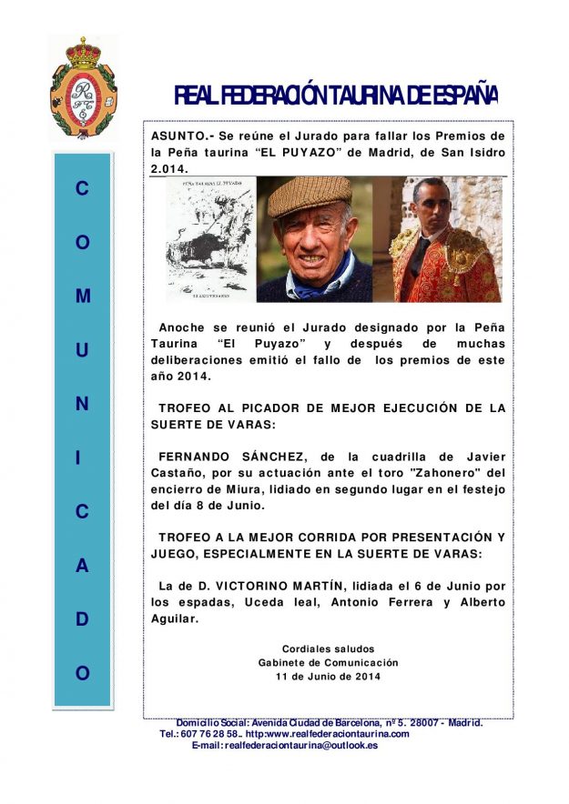 Fallados los Premios de la Peña taurina EL PUYAZO de Madrid 2014, HemerotecaPor Claudia Starchevich12 junio, 2014 Informa Real Federación Taurina de España
