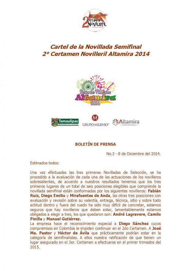Cartel de la Novillada Semifinal 2° – Certamen Novilleril Altamira 2014 2014, HemerotecaPor Claudia Starchevich9 diciembre, 2014 Informa desde México.Fiesta Brava