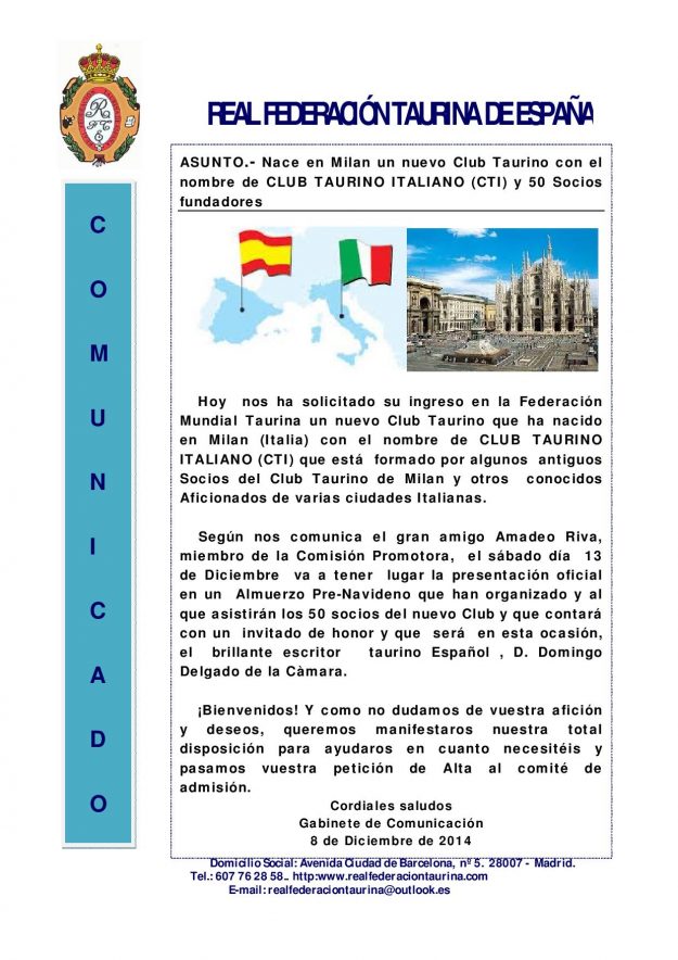 Nace en Milán un nuevo Club Taurino con el nombre de CLUB TAURINO ITALIANO (CTI) y 50 Socios fundadores 2014, HemerotecaPor Claudia Starchevich10 diciembre, 2014 Informa Real Federación Taurina de España