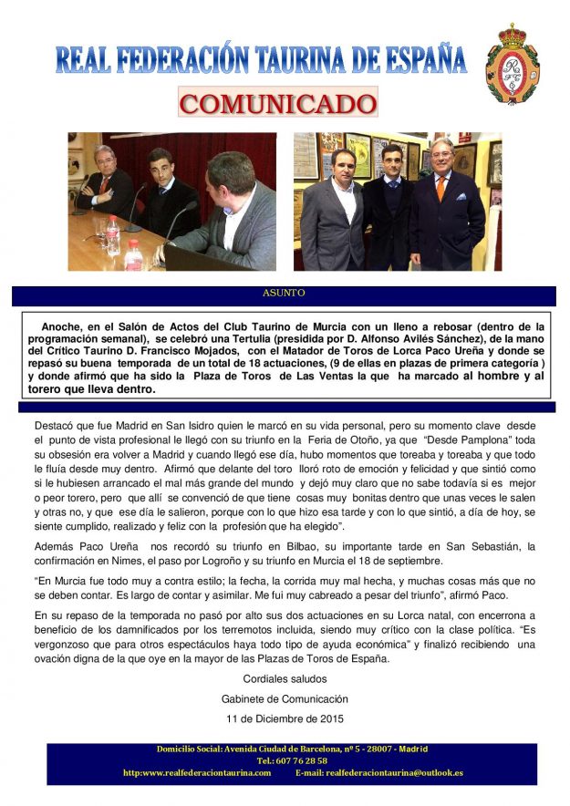 Jornada en el Club Taurino de Murcia 2015, HemerotecaPor Claudia Starchevich16 diciembre, 2015 Informa Real Federación Taurina de España
