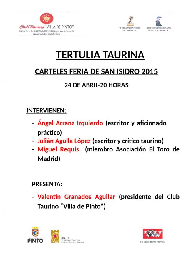 Tertulia carteles San Isidro 2015 2015, HemerotecaPor Claudia Starchevich24 abril, 2015 Informa Club Taurino «Villa de Pinto»