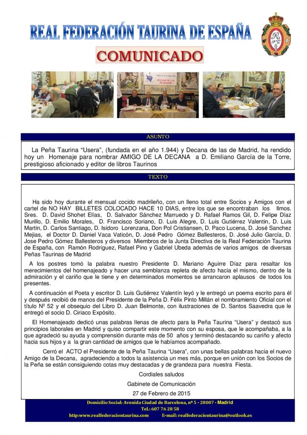 Peña Taurina `USERA´ de Madrid rindió homenaje al editor de libros taurinos D. Emiliano García de la Torre 2015, HemerotecaPor Claudia Starchevich2 marzo, 2015 Informa Real Federación Taurina de España
