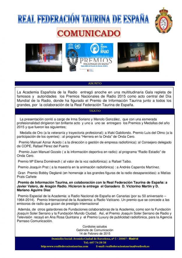 Premios Nacionales de Radio 2015 2015, HemerotecaPor Claudia Starchevich16 febrero, 2015 Informa Real Federación Taurina de España