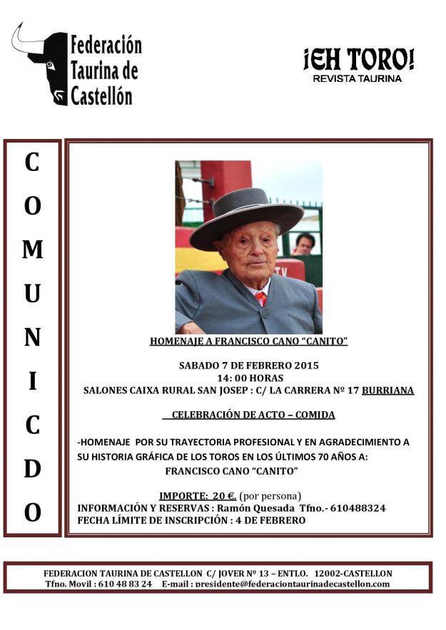 Homenaje a Francisco Cano `Canito´ en la Federacion Taurina de Castellón 2015, HemerotecaPor Claudia Starchevich6 febrero, 2015 Informa Real Federación Taurina de Castellón