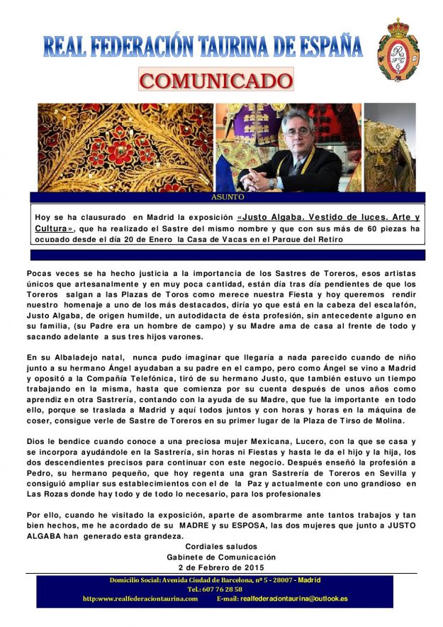 Clausurado en Madrid la exposición `Justo Algaba. Vestido de luces. Arte y Cultura´ 2015, HemerotecaPor Claudia Starchevich4 febrero, 2015 Informa Real Federación Taurina de España