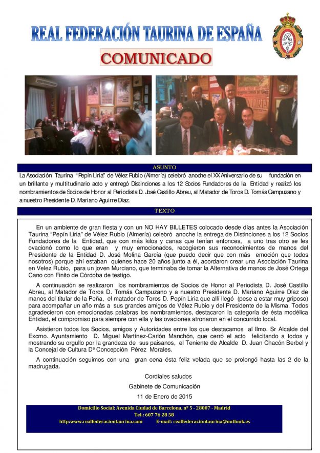 Asociación Taurina `Pepín Liria´nombró Socios de Honor a Tomás Campuzano (Escalera del Éxito 51) y a Mariano Aguirre Díaz (Escalera del Éxito 76) 2015, HemerotecaPor Claudia Starchevich17 enero, 2015 Informa Real Federación Taurina de España