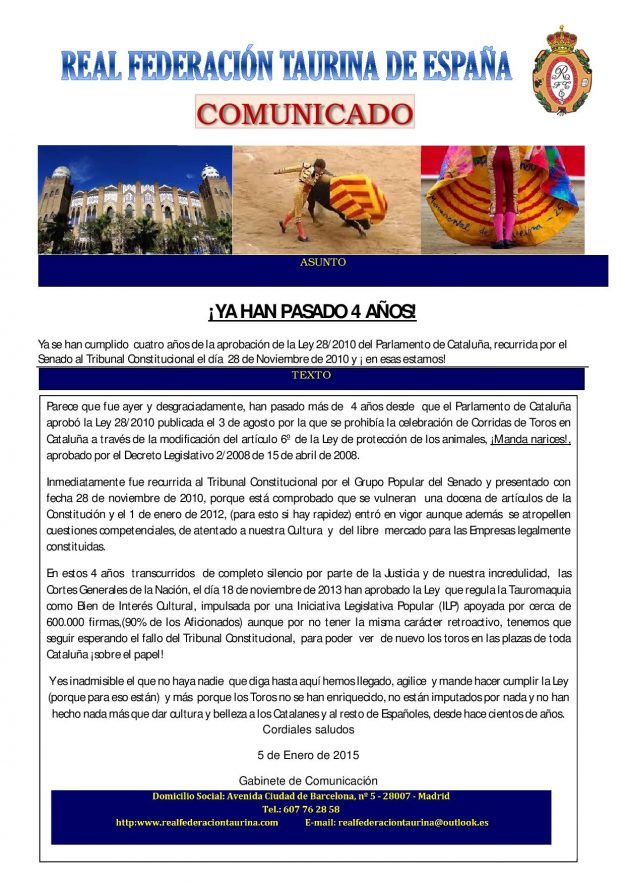 Ya han pasado 4 años! 2015, HemerotecaPor Claudia Starchevich9 enero, 2015 Informa Real Federación Taurina de España