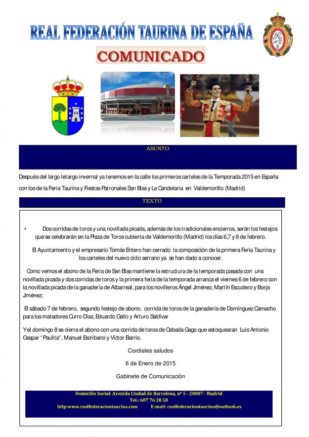 Valdemorillo levanta el telón 2015, HemerotecaPor Claudia Starchevich11 enero, 2015 Informa Real Federación Taurina de España
