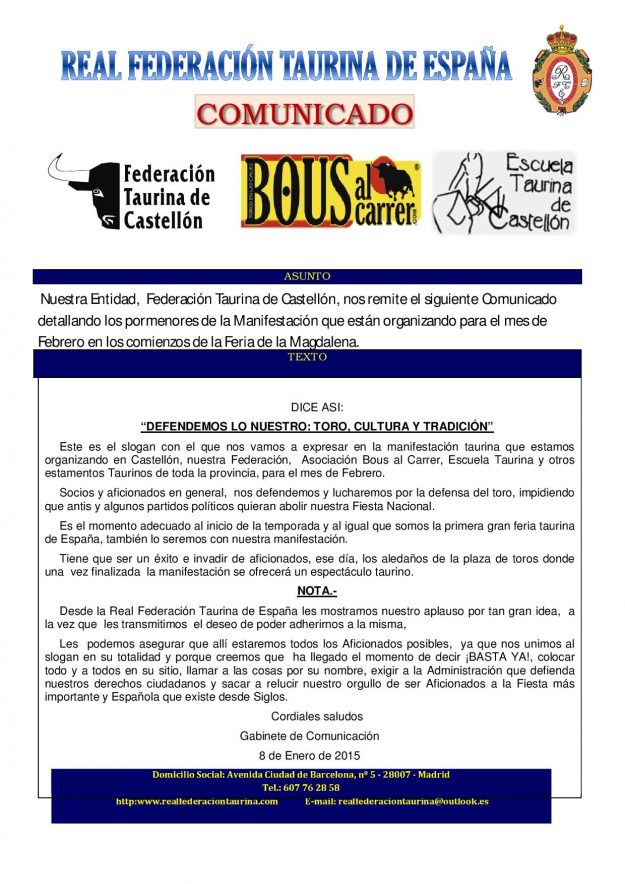 Manifestación en la Feria de la Magdalena 2015, HemerotecaPor Claudia Starchevich10 enero, 2015 Informa Real Federación Taurina de España