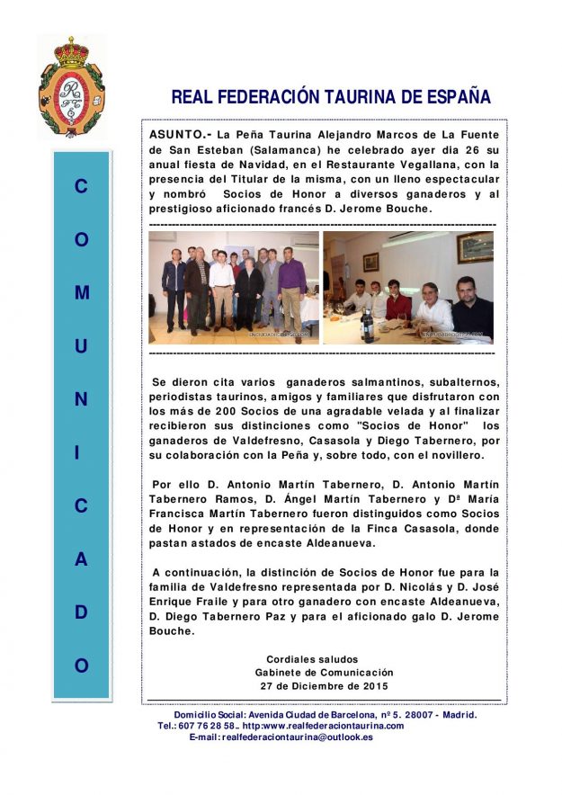 Celebraciones de las Fiestas Navideñas en las Peñas Taurinas españolas 2015, HemerotecaPor Claudia Starchevich28 diciembre, 2015 Informa Real Federación Taurina de España