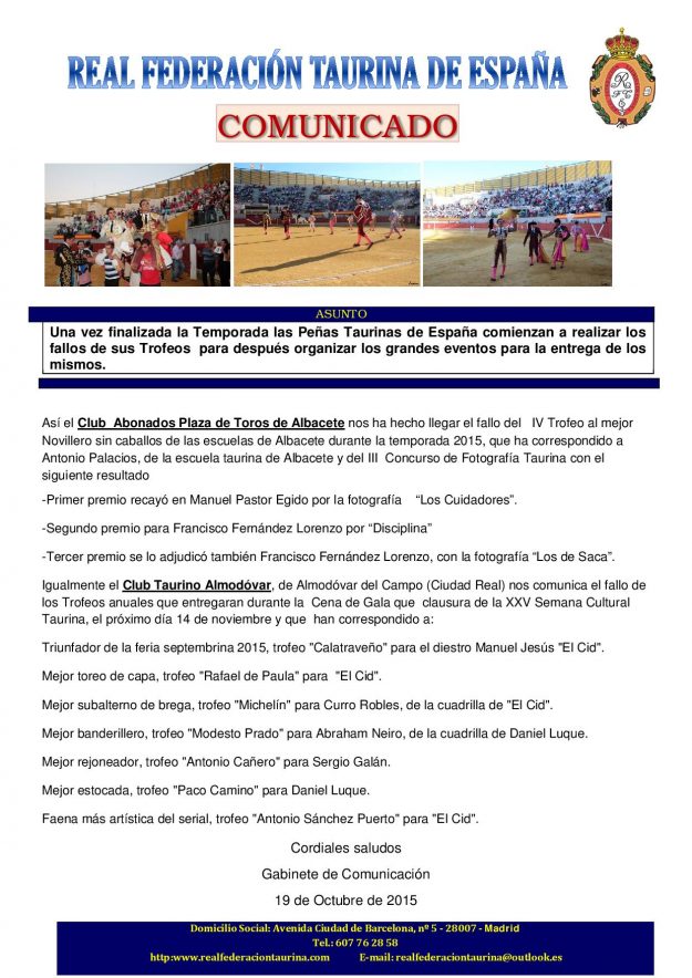 Club Abonados Plaza de Toros de Albacete 2015, HemerotecaPor Claudia Starchevich22 octubre, 2015 Informa Real Federación Taurina de España
