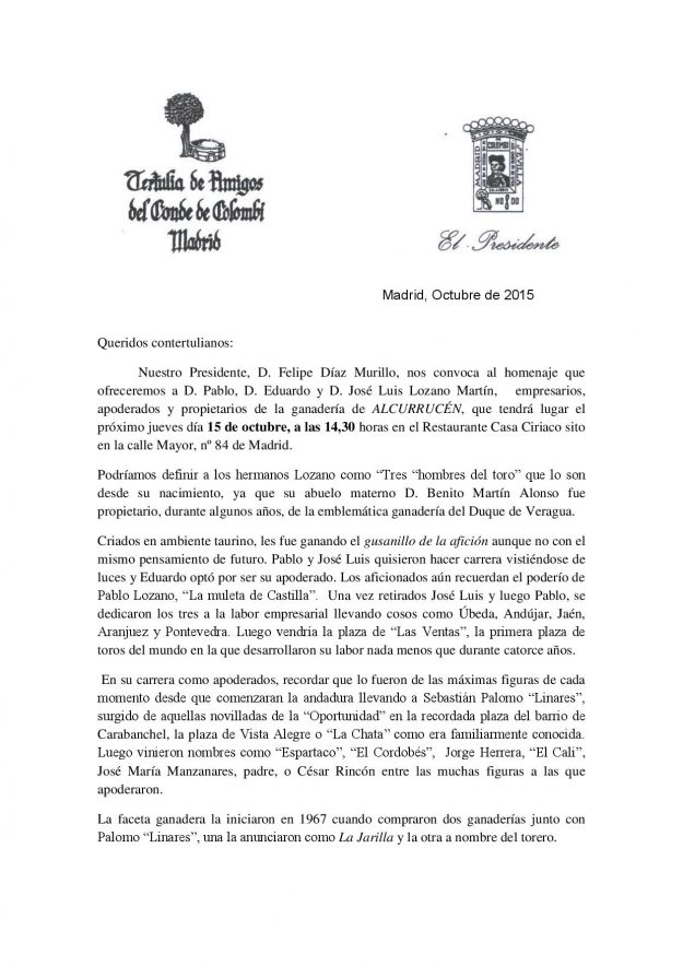 Tertulia Amigos del Conde de Cólombí rendirá homenaje a D. Pablo, D. Eduardo y D. José Luis Lozano Martín 2015, HemerotecaPor Claudia Starchevich8 octubre, 2015 Informa Julián Agulla