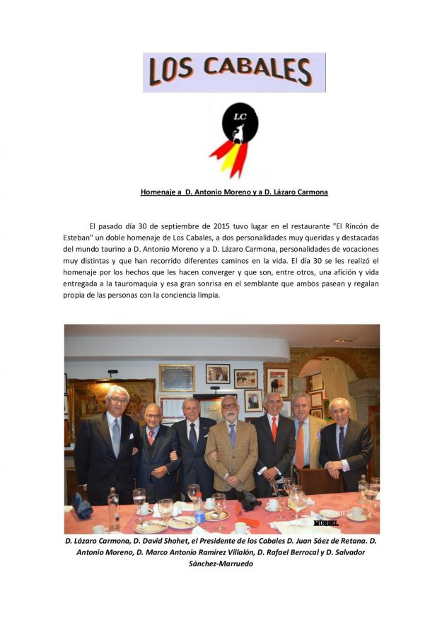 Homenaje a D. Antonio Moreno y a D. Lázaro Carmona en la Peña Taurina `Los Cabales´ 2015, HemerotecaPor Claudia Starchevich8 octubre, 2015 Informa Juan Sáez de Retana. Reconocimiento «Un Romántico del Toreo – Eafael Sánchez «Pipo»