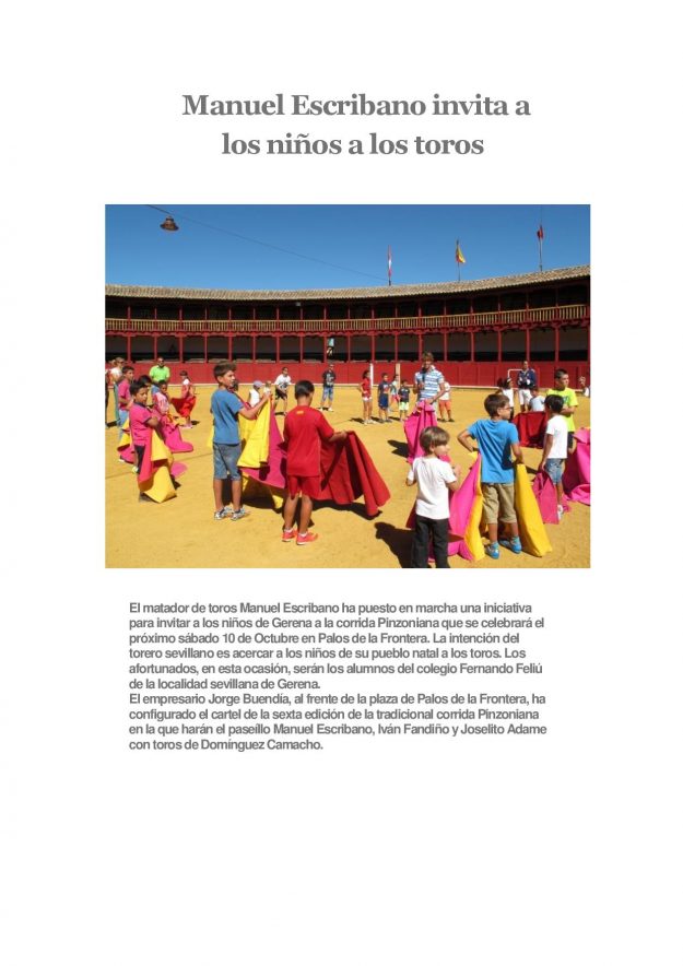 Manuel Escribano, invita a los niños a los toros 2015, HemerotecaPor Claudia Starchevich9 octubre, 2015 Informa Comunicación Manuel Escribano