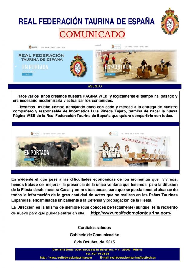 Real Federación Taurina de España estrena página Web 2015, HemerotecaPor Claudia Starchevich9 octubre, 2015 Informa Real Federación Taurina de España