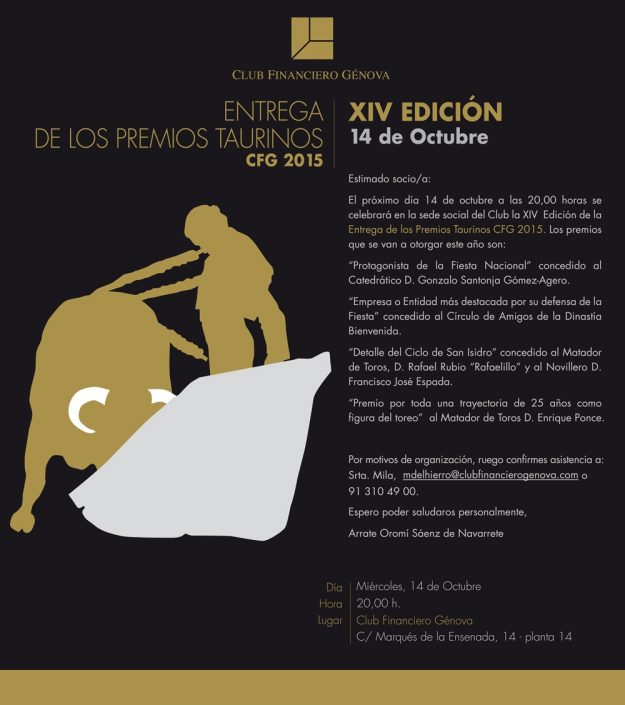 XIV Edición`Entrega de los Premios Taurinos Club Financiero Génova 2015´ 2015, HemerotecaPor Claudia Starchevich9 octubre, 2015 Informa Redacción Sabios del Toreo