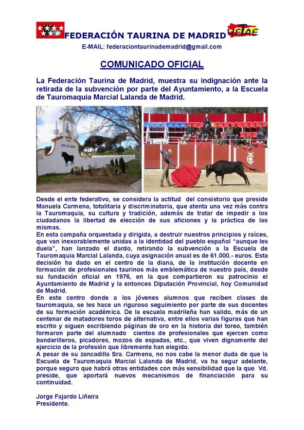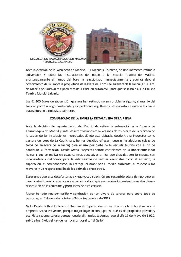 Retirada subvención a la Escuela Marcial Lalanda de Madrid 2015, HemerotecaPor Claudia Starchevich25 septiembre, 2015 Informa Federación Taurina de Madrid