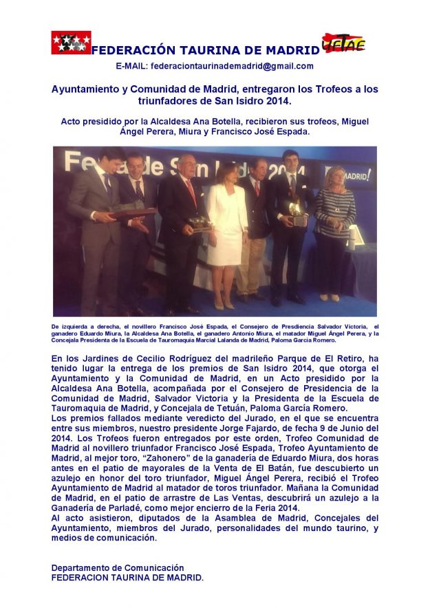 Ayuntamiento y Comunidad de Madrid, entregaron los Trofeos a los triunfadores de San Isidro 2014 2015, HemerotecaPor Claudia Starchevich18 mayo, 2015 Informa Federación Taurina de Madrid