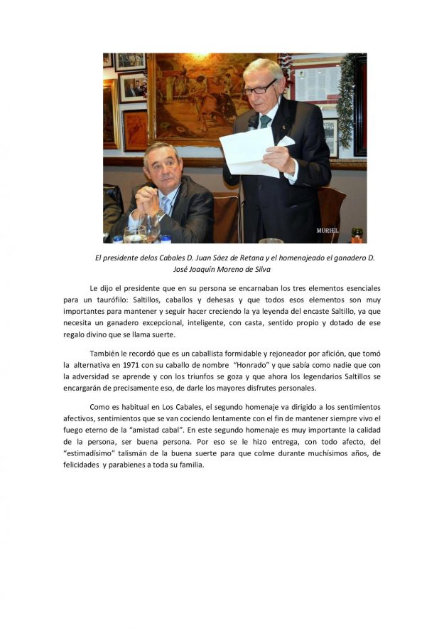 Homenaje a Don Jose Joaquín Moreno De Silva en la Peña Taurina `Los Cabales´ 2016, HemerotecaPor Claudia Starchevich4 enero, 2016 Informa Juan Sáez de Retana (Reconocimiento Un Romántico del Toreo Rafael Sánchez Pipo)