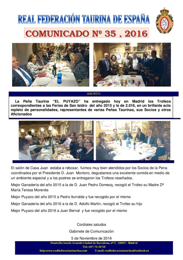 Respetados Caballeros, Damas y Jeromines: Como es costumbre, celebraremos, si Dios quiere, la cena anual de la Pascua del Nacimiento del Señor y despedida del año dos mil dieciséis, el miércoles día 14 de diciembre en el Hotel Ritz, Plaza de la Lealtad Nº 5 (Madrid). Antes de la Cena, a las 20:00 horas,…
