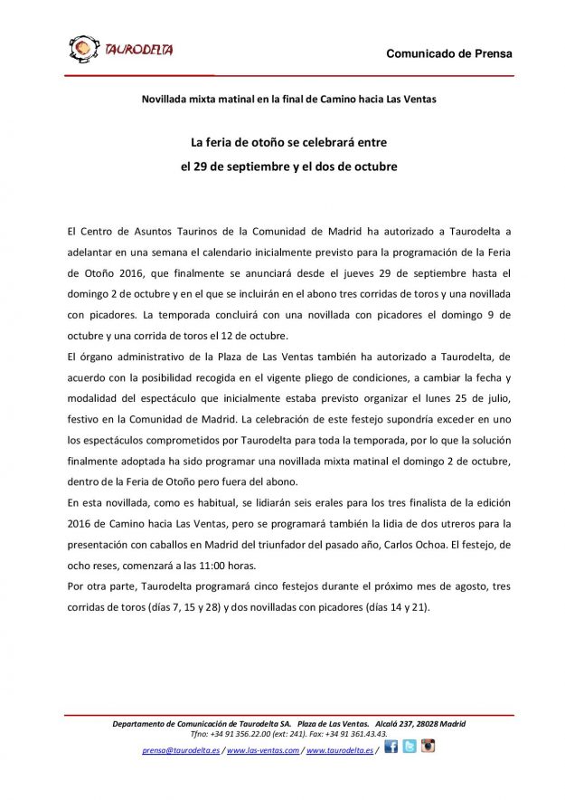 La Comunidad de Madrid saca a concurso laexplotación de la Plaza de Toros de Las Ventas con nuevas condiciones 2016, HemerotecaPor Claudia Starchevich2 agosto, 2016 Informa José Luis Díez