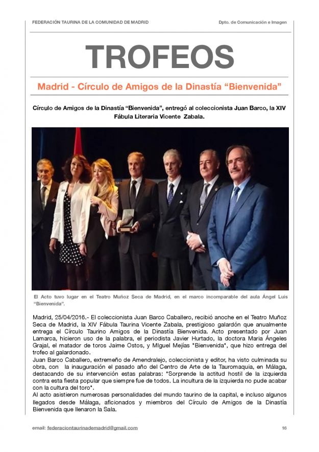 III Trofeo Nacional a la Promoción y Fomento de la Tauromaquia (UFTAE) 2016, HemerotecaPor Claudia Starchevich12 junio, 2016